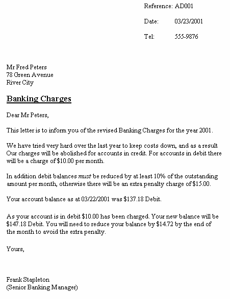 <body> <@ 50>Reference:<@ 58>AD001 <@ 50>Date:<@ 58>${DATE} <@ 50>Tel:<@ 58>555-9876 <indent 10> %{title} %{firstname} %{lastname} ${houseno} %{street} %{town} <size 15><b><u>Banking Charges</u></b><size 12> Dear %{title} %{lastname}, This letter is to inform you of the revised Banking Charges for the year 2001. We have tried very hard over the last year to keep costs down, and as a result Our charges will be abolished for accounts in credit. For accounts in debit there will be a charge of $10.00 per month. In addition debit balances must be reduced by at least 10% of the outstanding amount per month, otherwise there will be an extra penalty charge of $15.00. Your account balance as at ${BALANCEDATE} was <abs ${balance}> {${balance}:<:0.00;Debit;Credit}. {${balance}:<:0.00;<insert debit-text>;<insert credit-text>} Yours, Frank Stapleton (Senior Banking Manager) </body> <label credit-text> As your account is in credit there will be no Banking Charge for this month. </label> <label debit-text> As your account is in debit $10.00 has been charged. Your new balance will be <abs {${balance}:-:10.00}> Debit. You will need to reduce your balance by {${balance}:/:10} by the end of the month to avoid the extra penalty. </label>