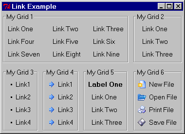 The "Link" widget is something I created for GRIDPLUS. It is a text string (which may have an associated icon) which behaves something like a hypertext link as commonly found in Web pages. The text string is highlighted when the mouse pointer is over the text (By default the text becomes underlined), clicking on the text will invoke an associated command. If the text also has an icon, clicking on the icon will also invoke the command.