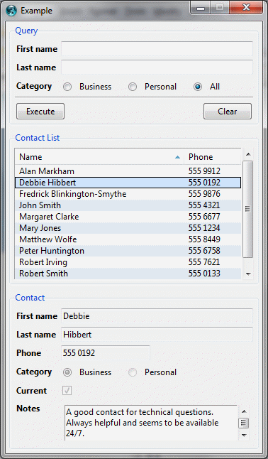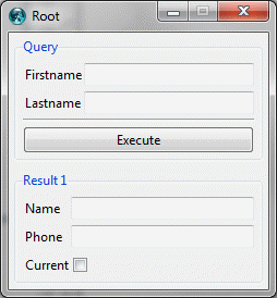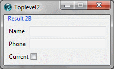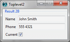proc mainDisplay {} { #-------------------------- # Set default widget width. gpoptions entryWidth 25 #---------------------------- # Create root window content. gridplus entry .query -stretch 0 -title "Query" { { "Firstname" .firstname} { "Lastname" .lastname} = {&b "Execute" .execute:ew} } gridplus entry .result1 -stretch 0 -title "Result 1" { { "Name" .name:ew} { "Phone" .phone:ew} {&c "Current" .current} } gridplus layout .main -wtitle "Root" { .query .result1:ew } pack .main #------------------------------ # Create toplevel1 and content. gridplus window .toplevel1 -wtitle "Toplevel1" gridplus entry .toplevel1.result2a -title "Result 2A" { {"Firstname" .firstname} {"Lastname" .lastname} } gridplus entry .toplevel1.dummy -title "Dummy" { {"Firstname" .firstname =Dummy} } gridplus layout .toplevel1.main { .toplevel1.result2a .toplevel1.dummy } pack .toplevel1.main #------------------------------ # Create toplevel2 and content. gridplus window .toplevel2 -wtitle "Toplevel2" gridplus entry .toplevel2.result2b -title "Result 2B" { { "Name" .name} { "Phone" .phone} {&c "Current" .current} } pack .toplevel2.result2b }